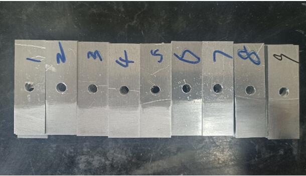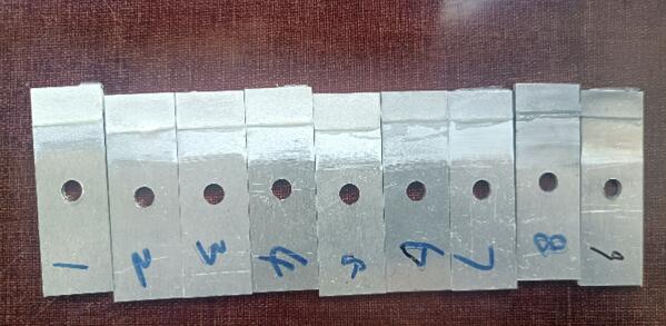 我們選取的砂布目數為:60、120、180、320、600、800、1200、1500、2000。我們分別按1-9給這個試片進行排序。1代表60目,2代表120目...,我們能從打磨痕跡看出,號數越大的,打磨越細膩,1500和2000目砂紙打磨的硬鋁試片基本能呈現出鏡面光澤。(下面的圖片拍攝可能是反光問題,不能看出差異,實物實際是很能看出來區別的,不信你試試,哈哈)